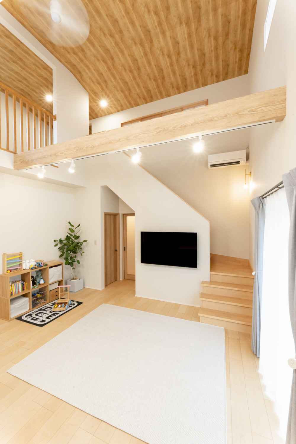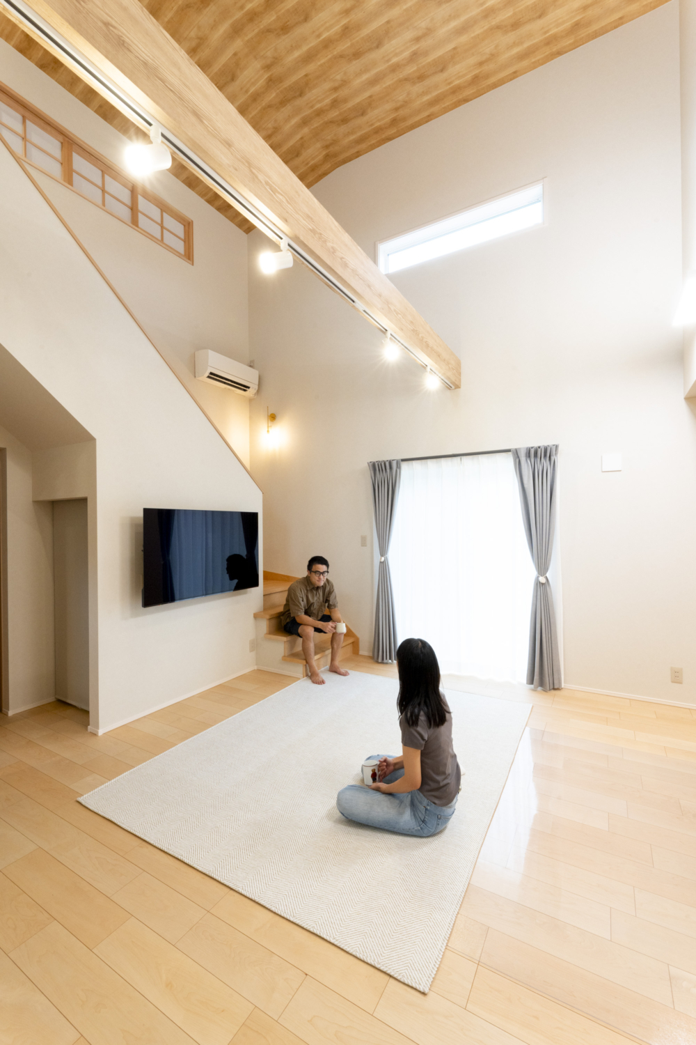 house with a double-height ceiling 大きな吹き抜けのリビングを中心とした