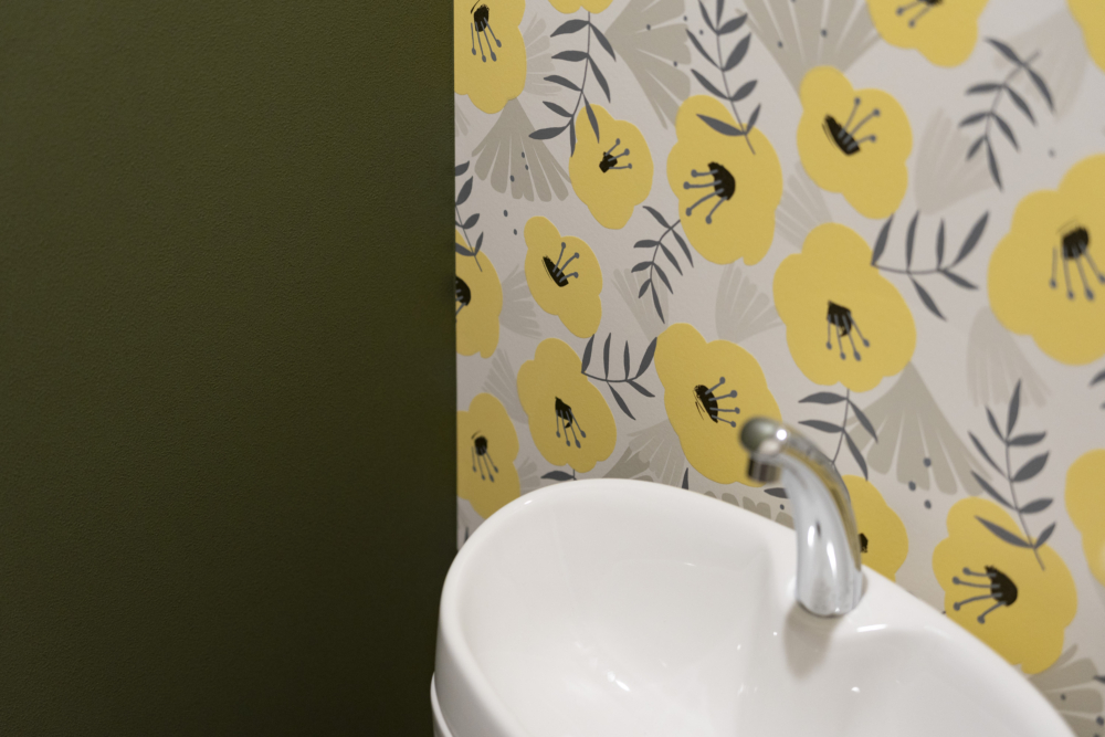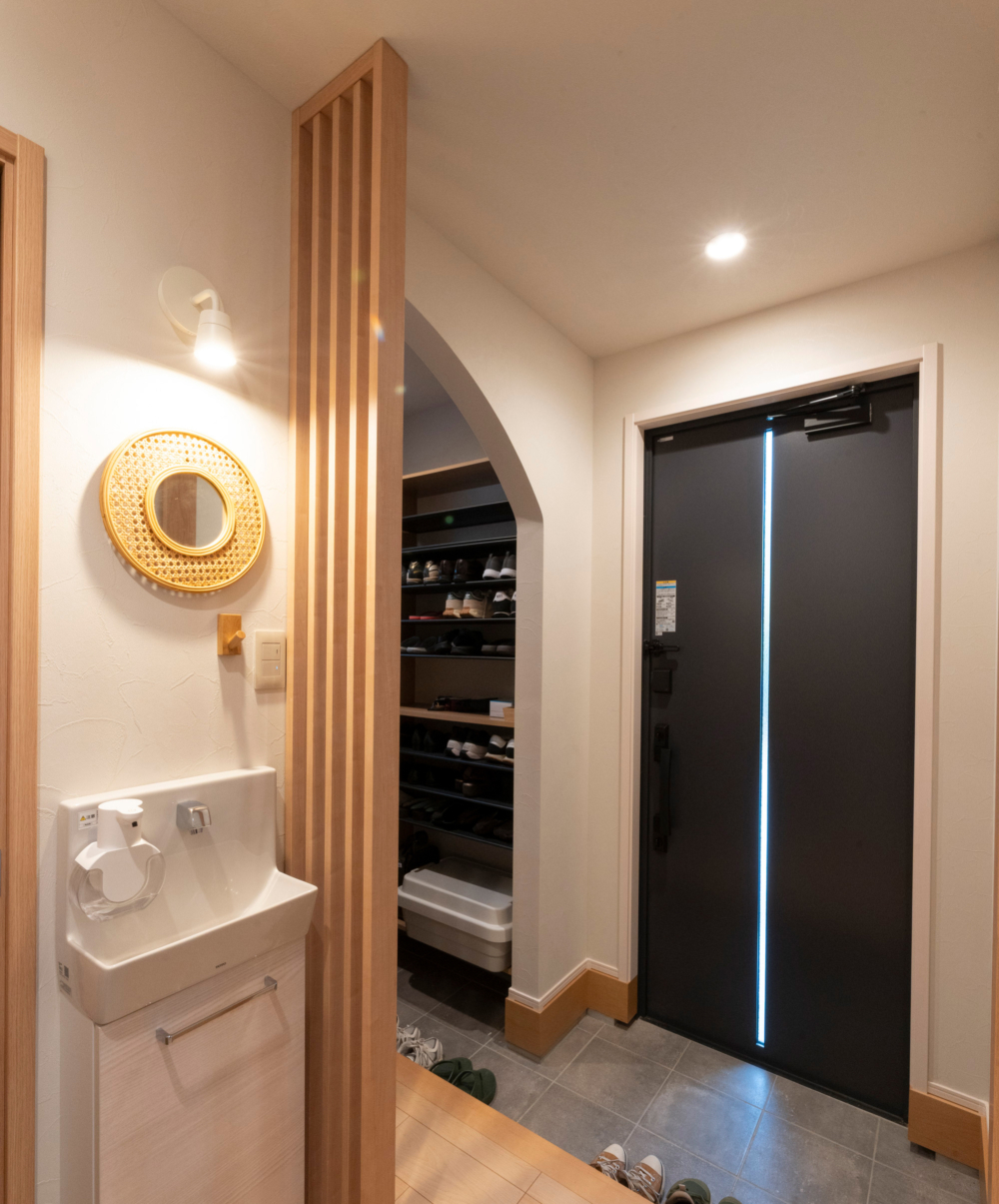 玄関近くの手洗い洗面は、ルーバーで目隠しをして