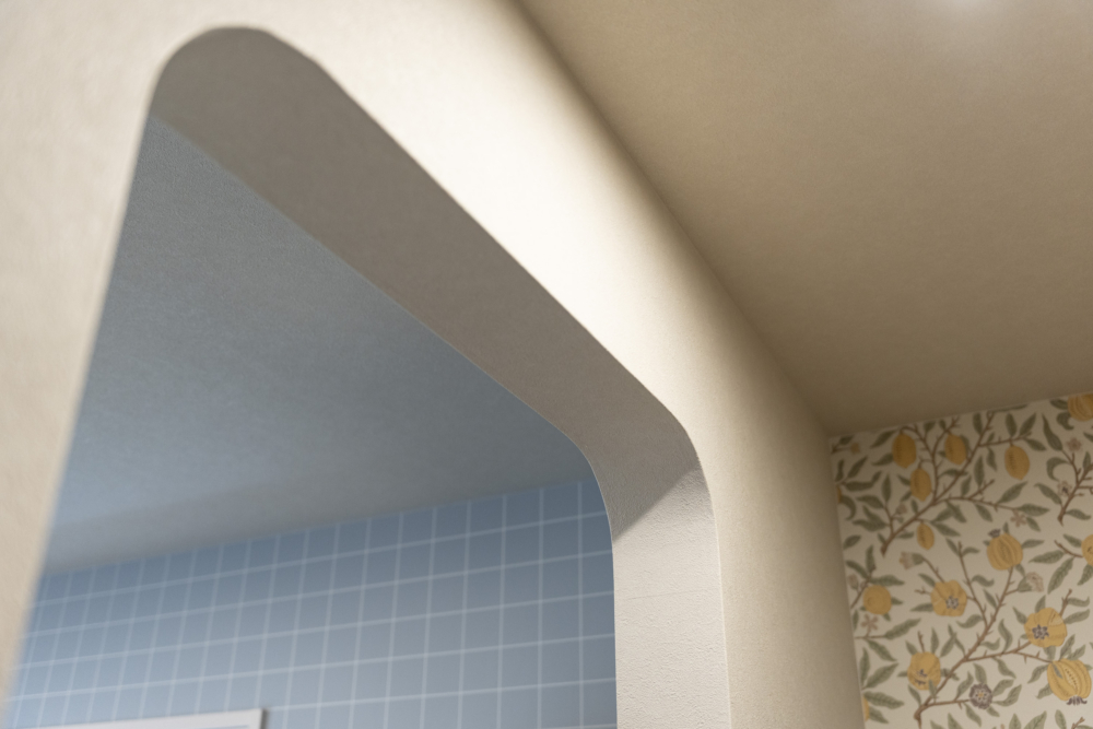 パントリーのアクセントクロス&キッチンへの入口部分はやわらかなアーチで