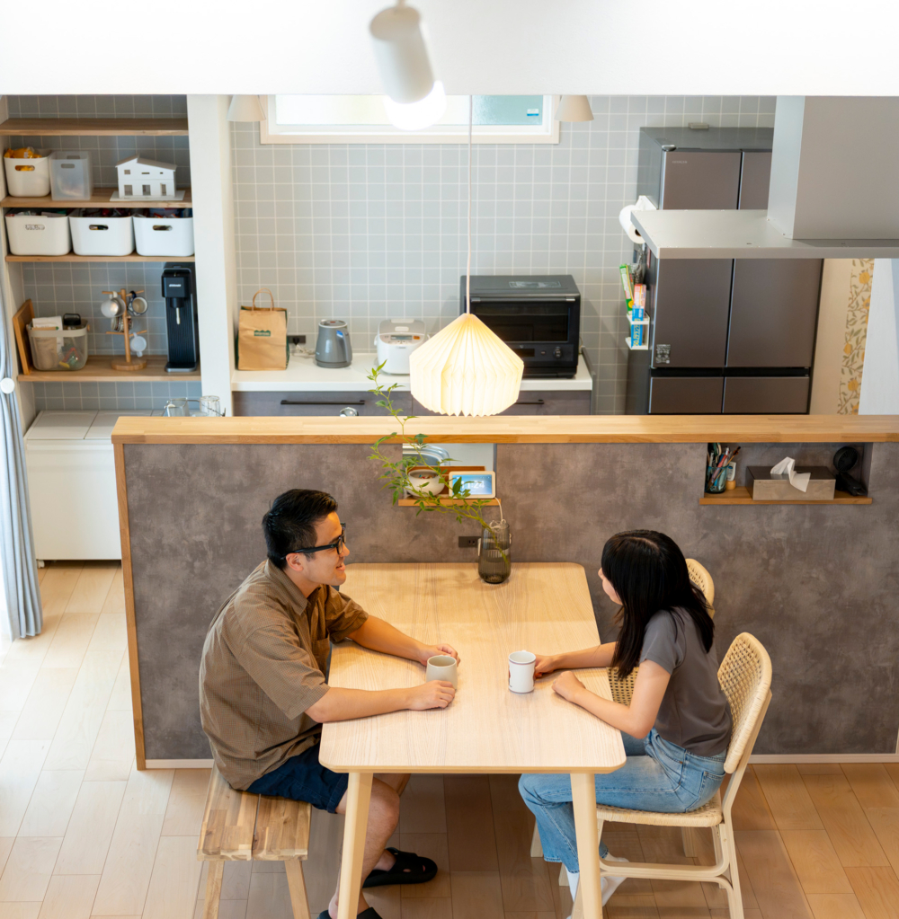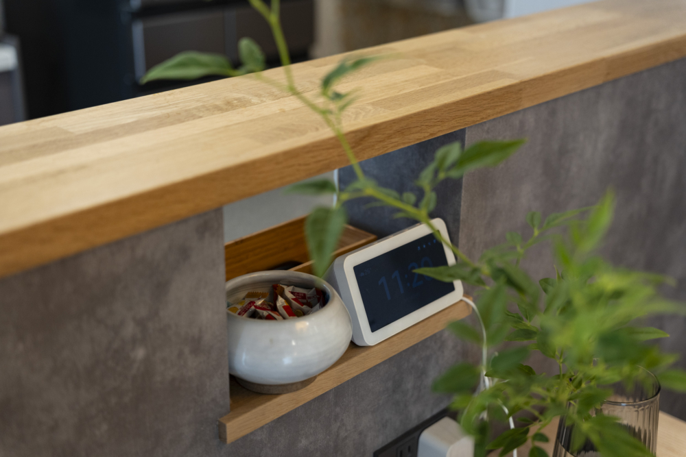 手前には造作カウンター。高さがあるため、キッチンの手元は目隠しされています。