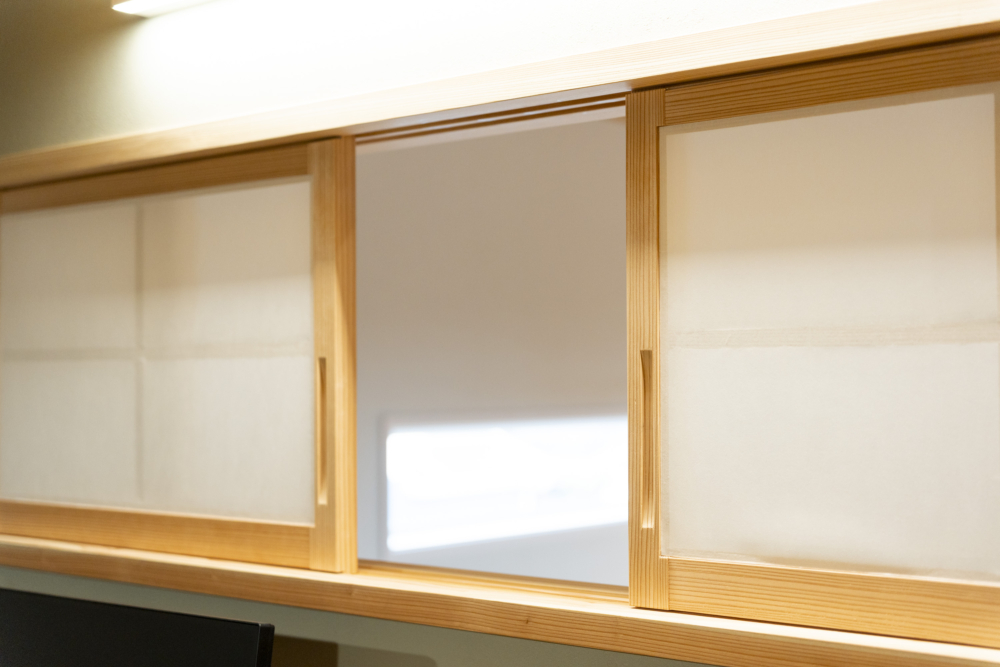 リビングを見下ろせる窓には障子、小上がりスペースは畳で和風テイストをプラスしました○
