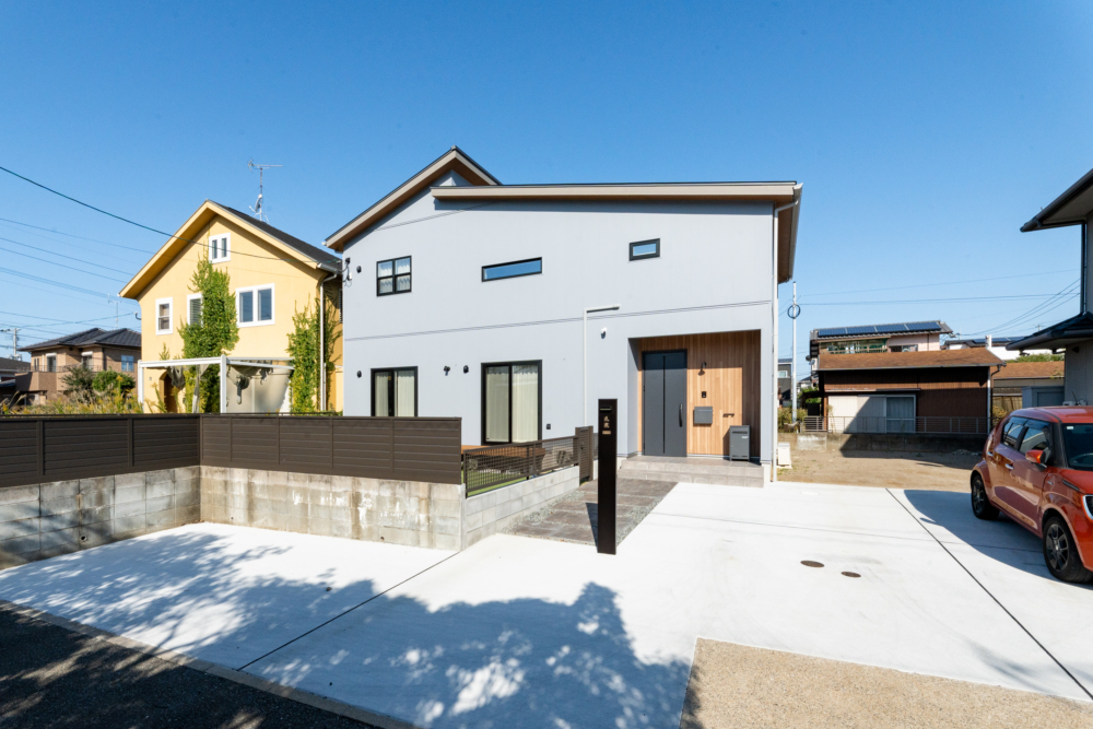 「和」のイメージを感じる片流れの屋根や、ニュアンスのあるくすみブルーの外壁がステキです。